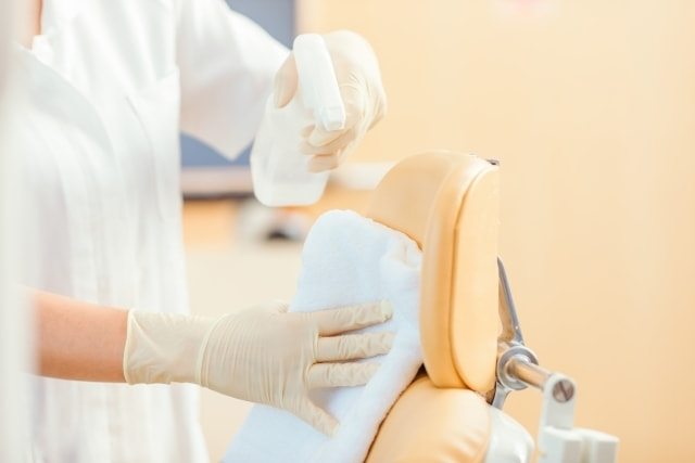 標準予防策(スタンダード・プリコーション)を適用。ゴム手袋を使い、一人ずつ交換。切削ハンドピースも一人ずつ滅菌。歯科用吸引装置(口腔外バキューム)設置